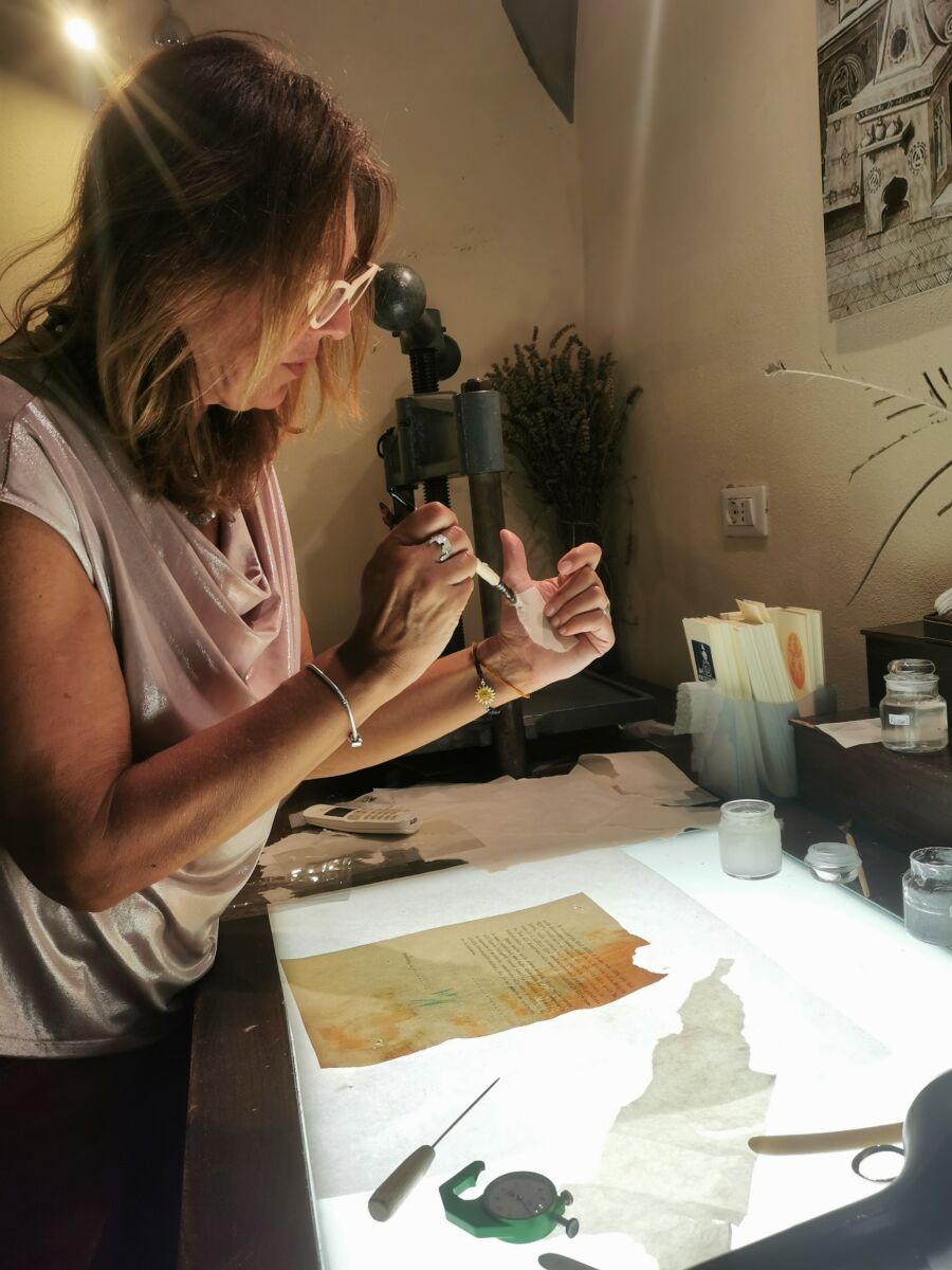 📃 We met her intent on restoring an archive from the 1940s attacked by molds and a string of the Diocesan Historical Archives of Volterra from 1500, which, thanks to her patient work, can be handed over to future generations.