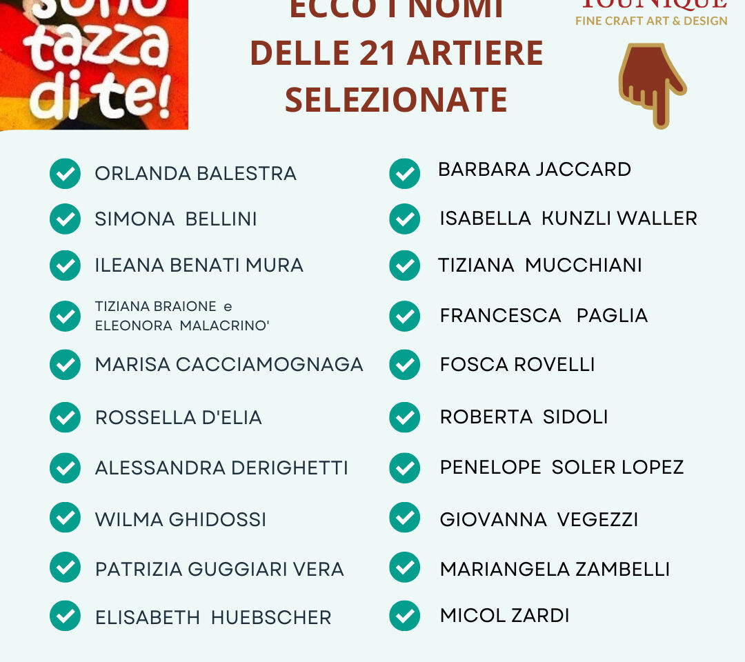 Sono finalmente ufficiali i nomi delle 21 artiste residenti in Svizzera, che hanno risposto alla sfida di realizzare una tazza unica, oggetto di design da collezione e che si uniranno alle altre 80 tazze della mostra SONO TAZZA DI TE! 100 smashing women designer all’interno dell’evento Younique Fine Craft Art & Design 2022